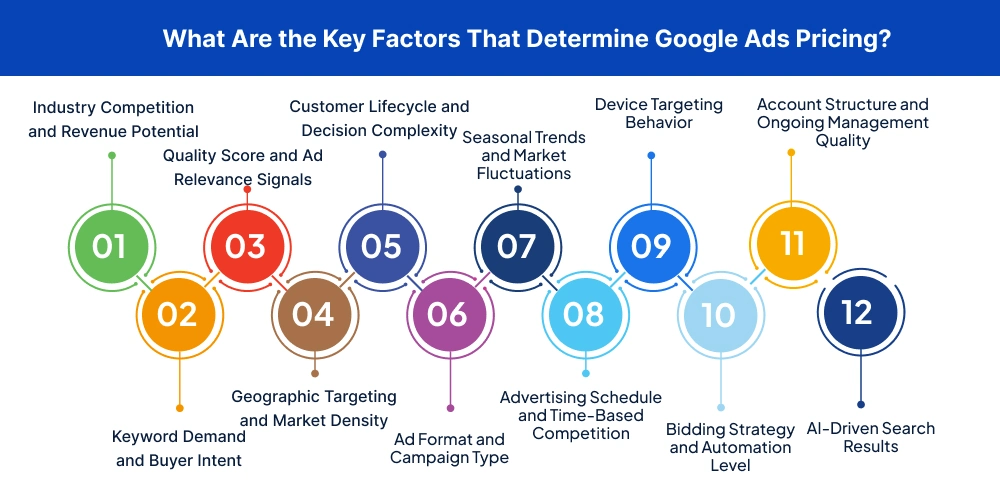 Your Google Ads cost depends on multiple factors including keyword competition, Quality Score, ad relevance, landing page experience, geographic targeting, device type, and bidding strategy. Ads that are highly relevant and well-targeted typically cost less per click while driving better results.